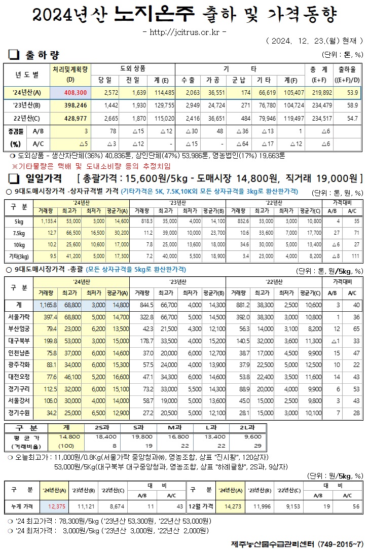 [노지온주]2024년산 출하 및 가격동향(12/23)