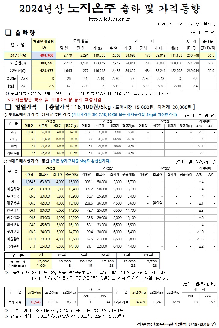[노지온주]2024년산 출하 및 가격동향(12/25)