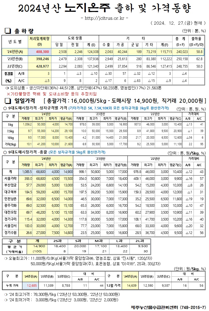 [노지온주]2024년산 출하 및 가격동향(12/27)