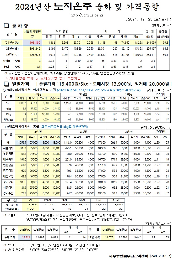 [노지온주]2024년산 출하 및 가격동향(12/28)