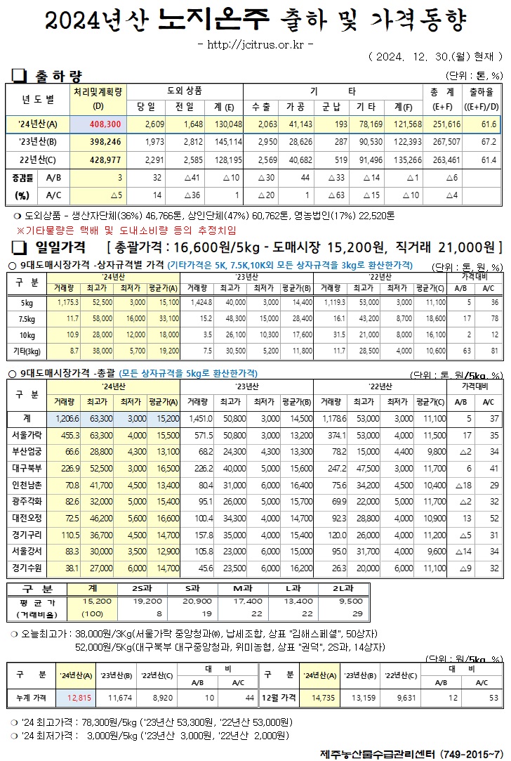 [노지온주]2024년산 출하 및 가격동향(12/30)