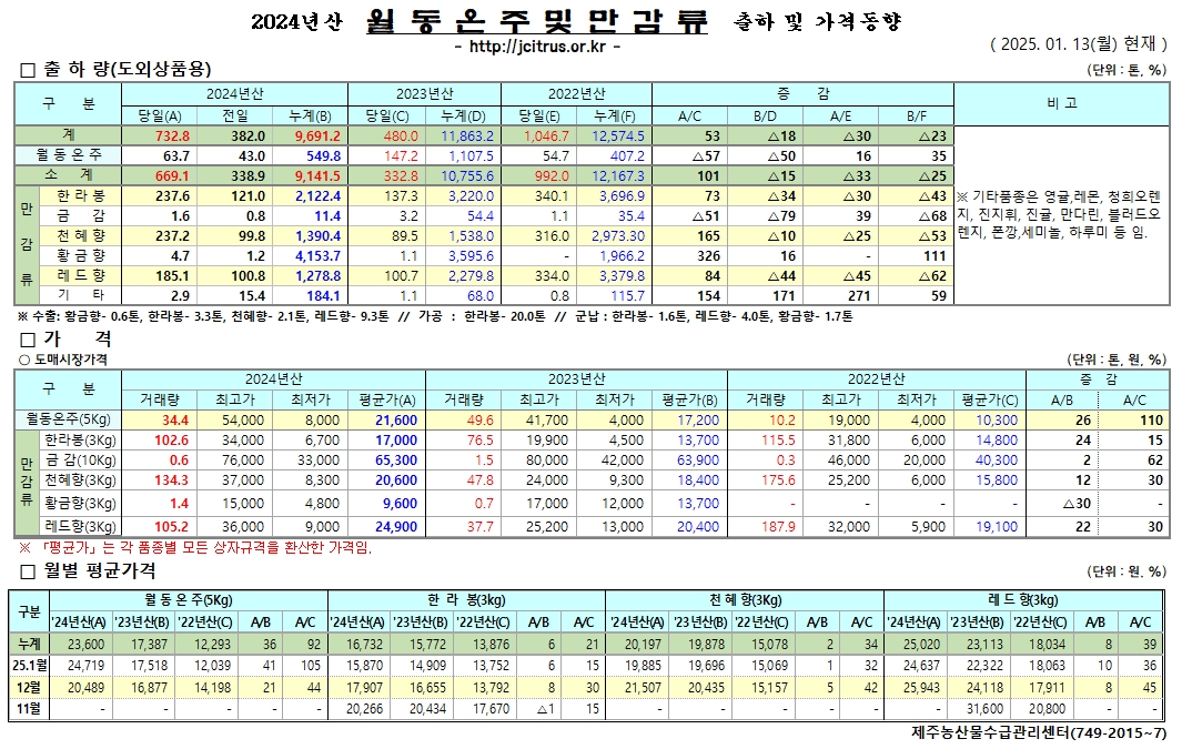 [월동&만감]2024년산 출하 및 가격동향(1/13)