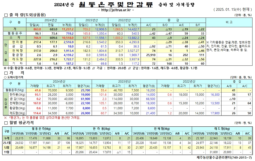 [월동&만감]2024년산 출하 및 가격동향(1/15)
