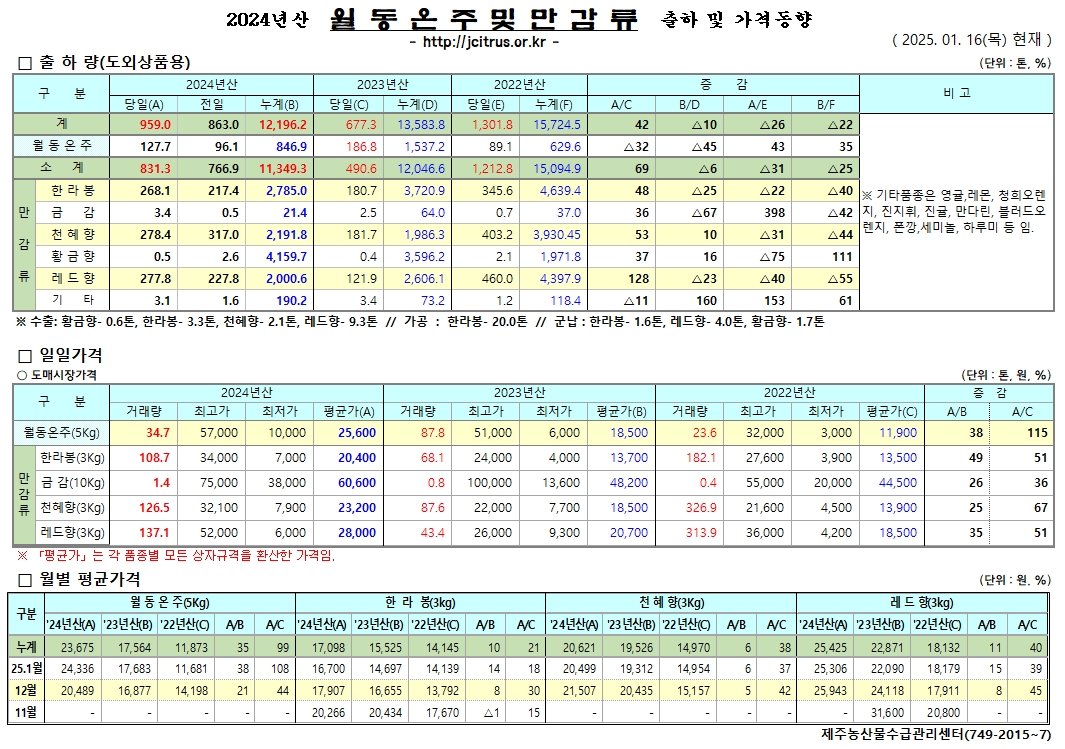 [월동&만감]2024년산 출하 및 가격동향(1/16)