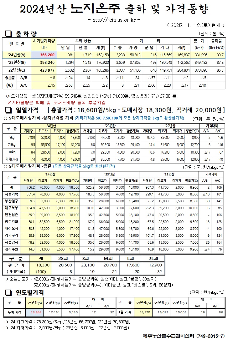 [노지온주]2024년산 출하 및 가격동향(1/18)