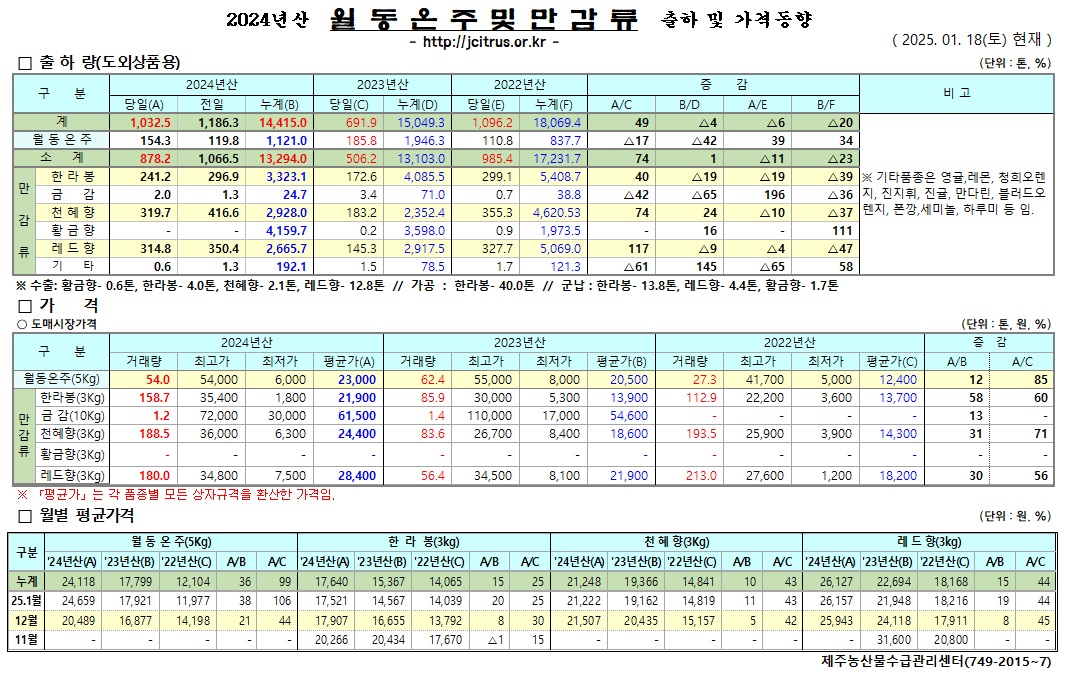 [월동&만감]2024년산 출하 및 가격동향(1/18)