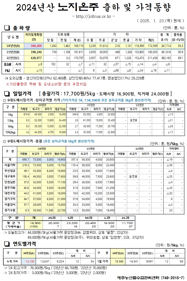 [노지온주]2024년산 출하 및 가격동향(1/23)
