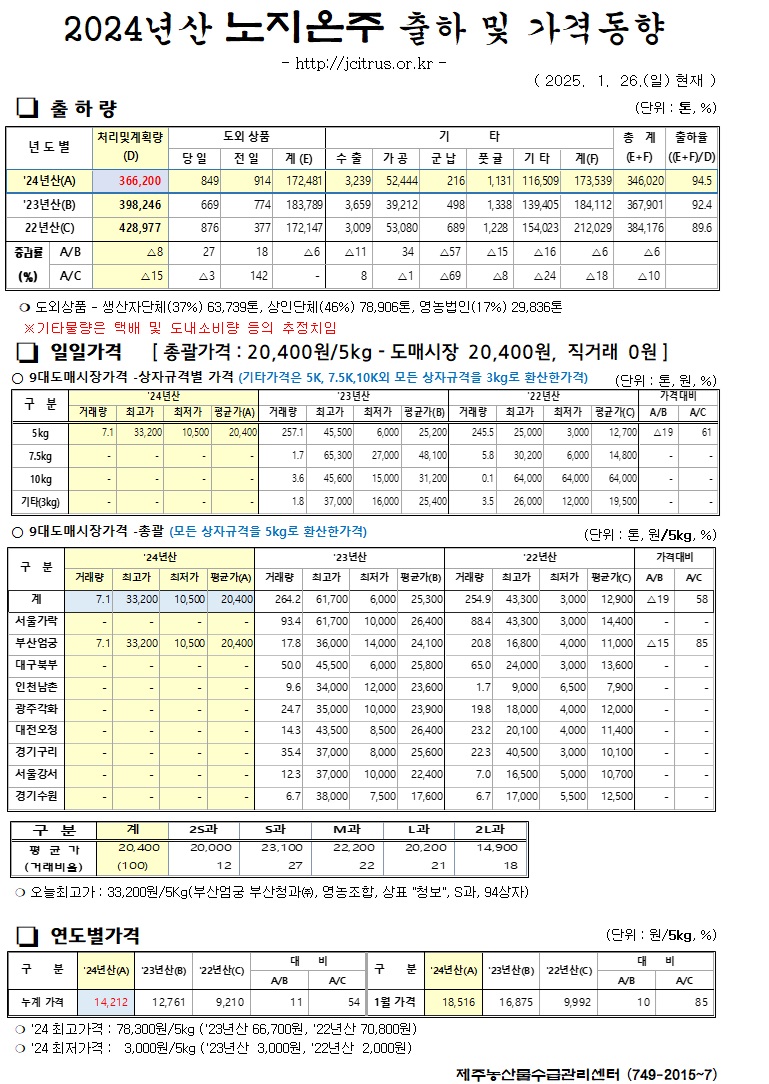 [노지온주]2024년산 출하 및 가격동향(1/26)