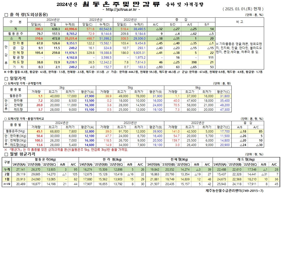 [월동&만감]2024년산 출하 및 가격동향(3/1)