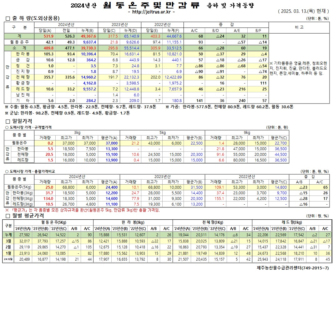 [월동&만감]2024년산 출하 및 가격동향(3/13)