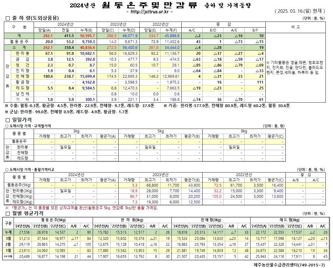 [월동&만감]2024년산 출하 및 가격동향(3/16)