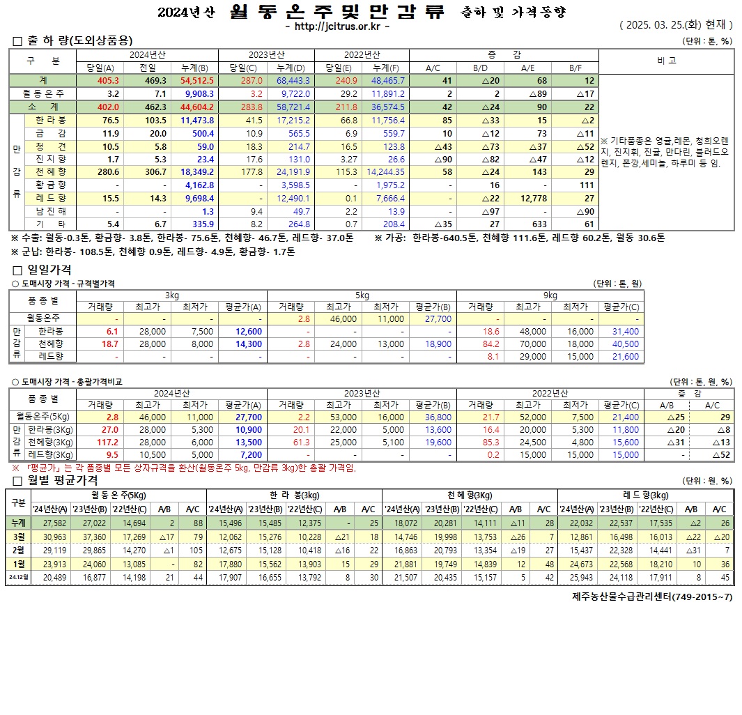 [월동&만감]2024년산 출하 및 가격동향(3/25)