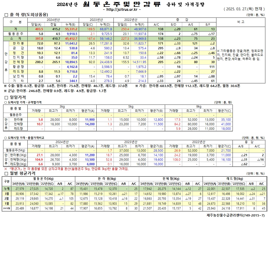 [월동&만감]2024년산 출하 및 가격동향(3/27)