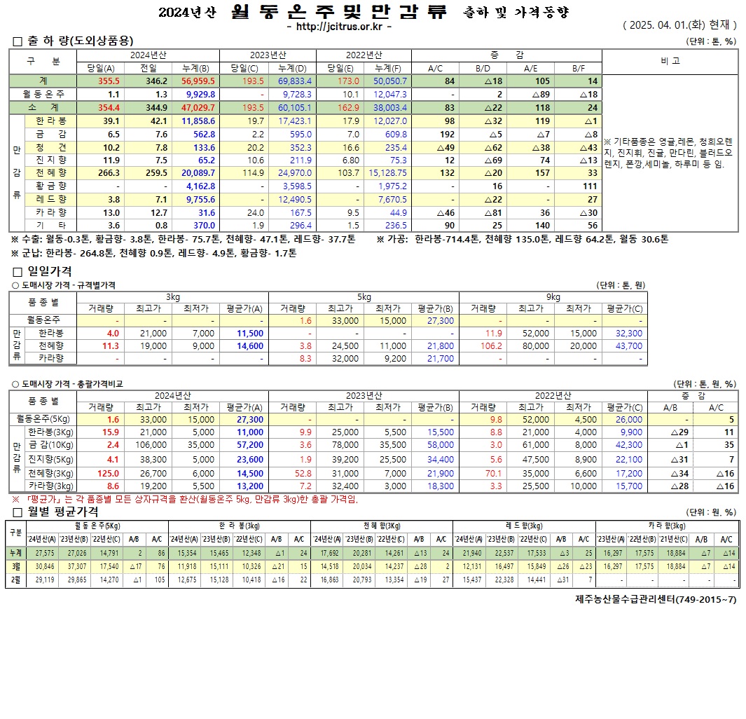 [월동&만감]2024년산 출하 및 가격동향(4/1)