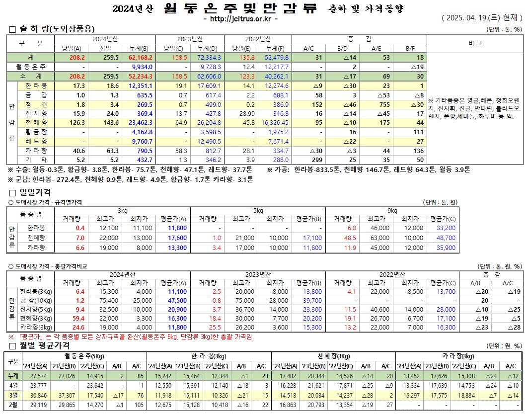 [월동&만감]2024년산 출하 및 가격동향(4/19)