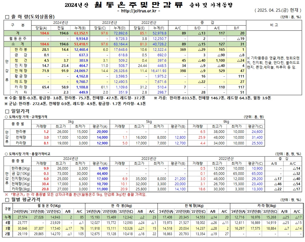 [월동&만감]2024년산 출하 및 가격동향(4/25)