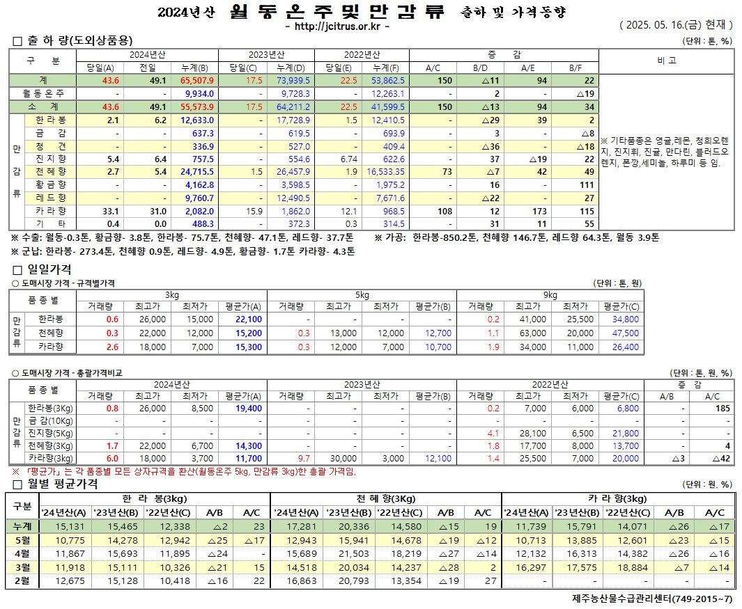 [월동&만감]2024년산 출하 및 가격동향(5/16)
