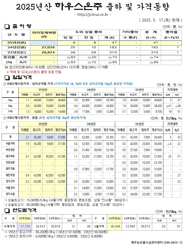 [하우스온주]2025년산 출하 및 가격동향(5/17)