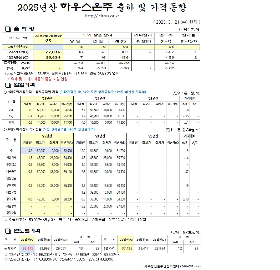 [하우스온주]2025년산 출하 및 가격동향(5/21)