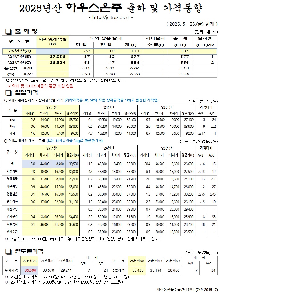 [하우스온주]2025년산 출하 및 가격동향(5/23)