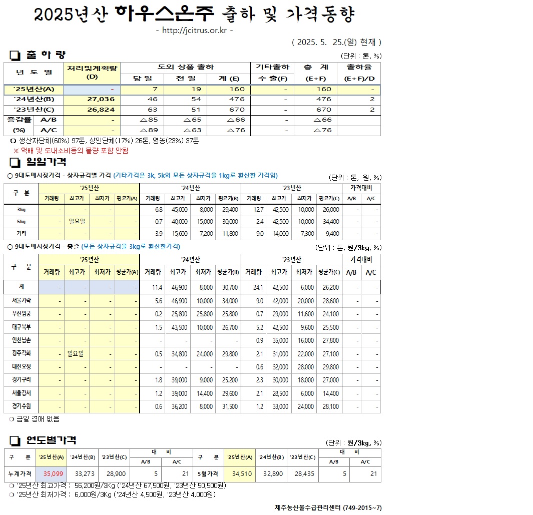 [하우스온주]2025년산 출하 및 가격동향(5/25)