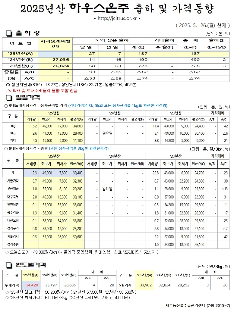 [하우스온주]2025년산 출하 및 가격동향(5/26)