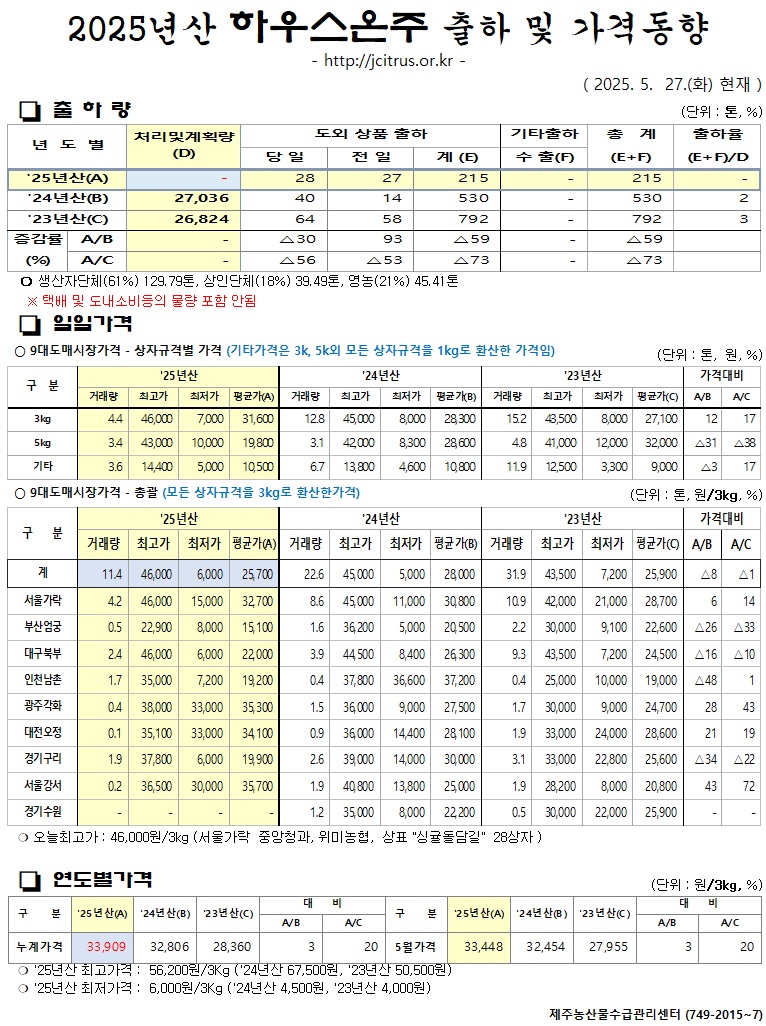 [하우스온주]2025년산 출하 및 가격동향(5/27)