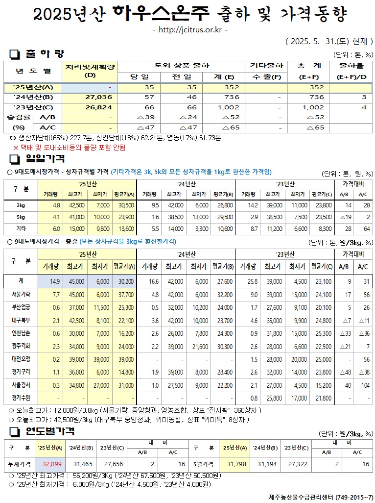 [하우스온주]2025년산 출하 및 가격동향(5/31)
