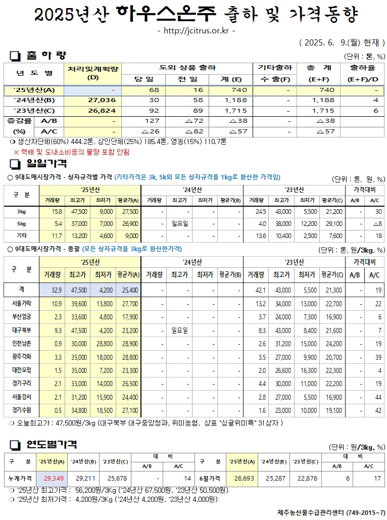 [하우스온주]2025년산 출하 및 가격동향(6/9)