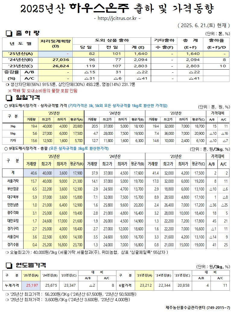 [하우스온주]2025년산 출하 및 가격동향(6/21)