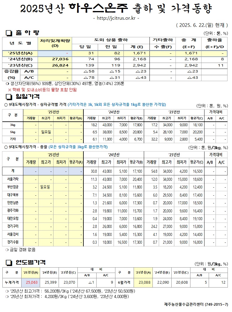 [하우스온주]2025년산 출하 및 가격동향(6/22)