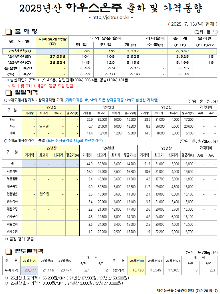 [하우스온주]2025년산 출하 및 가격동향(7/13)