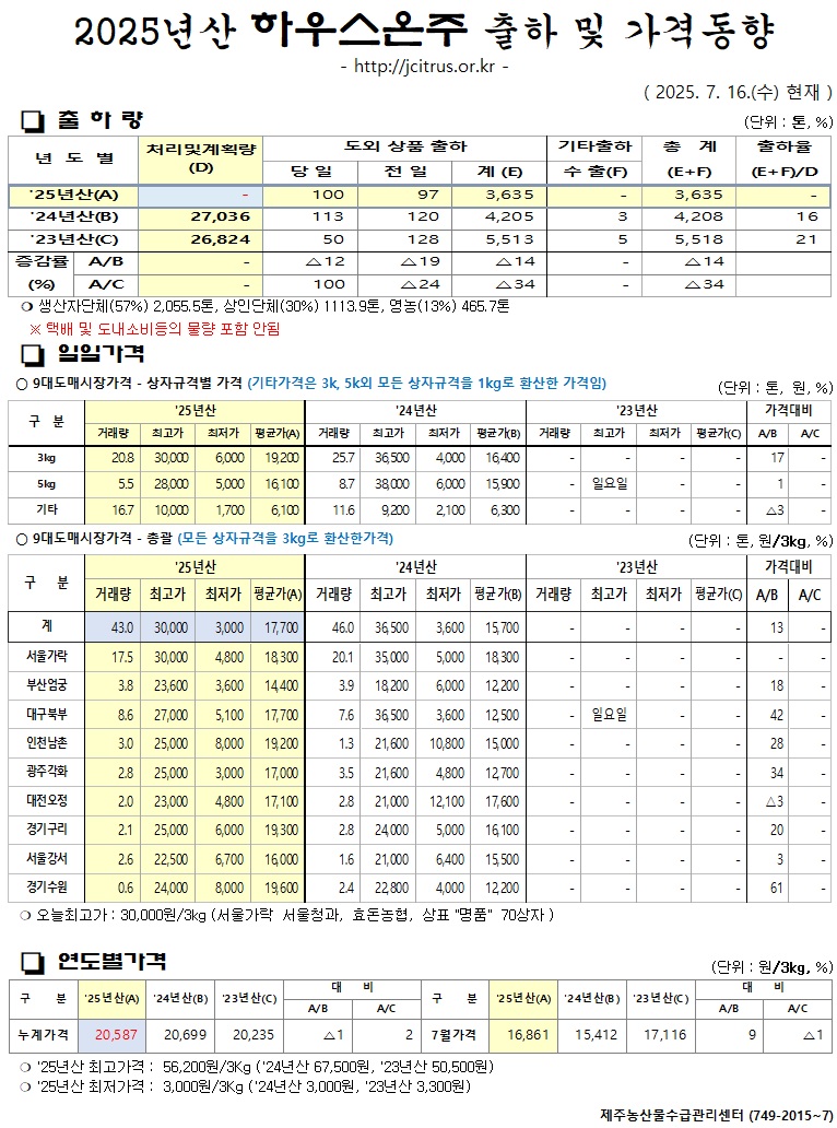 [하우스온주]2025년산 출하 및 가격동향(9/30)