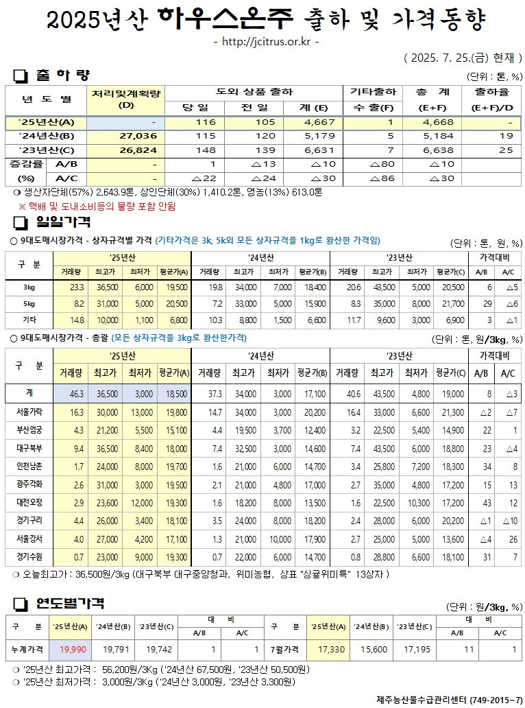 [하우스온주]2025년산 출하 및 가격동향(10/1)
