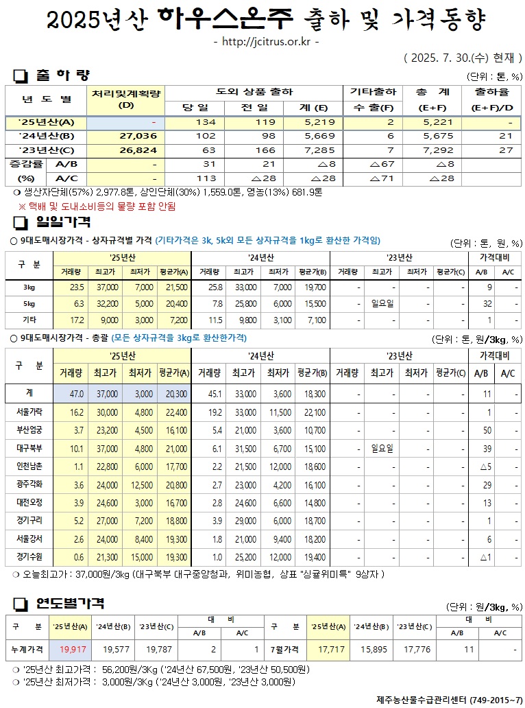 [하우스온주]2025년산 출하 및 가격동향(7/30)