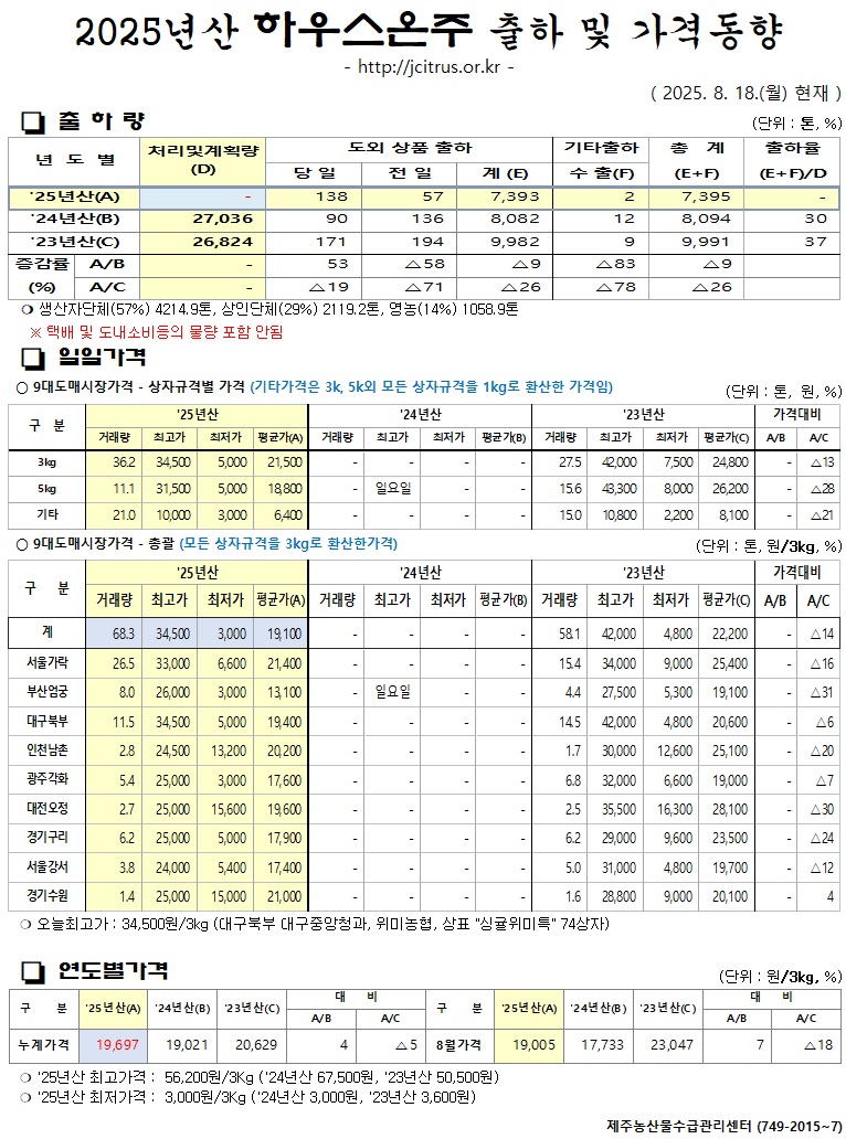 [하우스온주]2025년산 출하 및 가격동향(8/18)