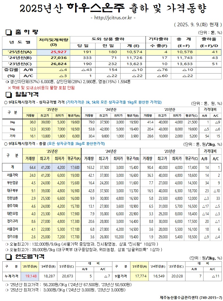 [하우스온주]2025년산 출하 및 가격동향(9/9)