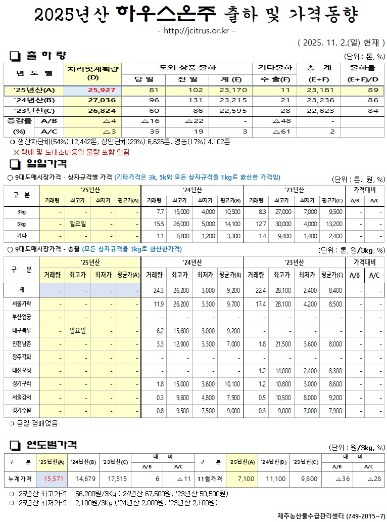 [하우스온주]2025년산 출하 및 가격동향(11/2)