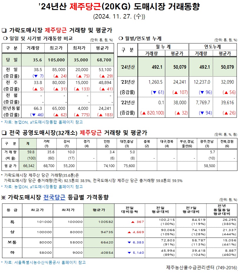 '24년산 제주당근(20kg) 도매시장 거래동향(11/27)