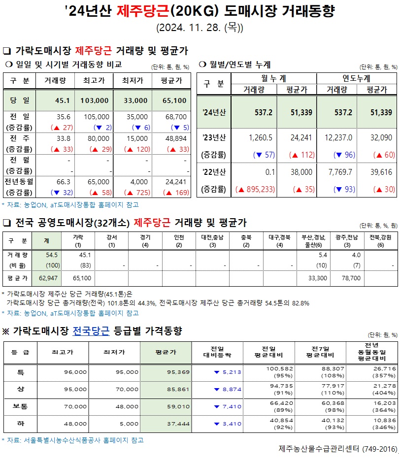 '24년산 제주당근(20kg) 도매시장 거래동향(11/28)