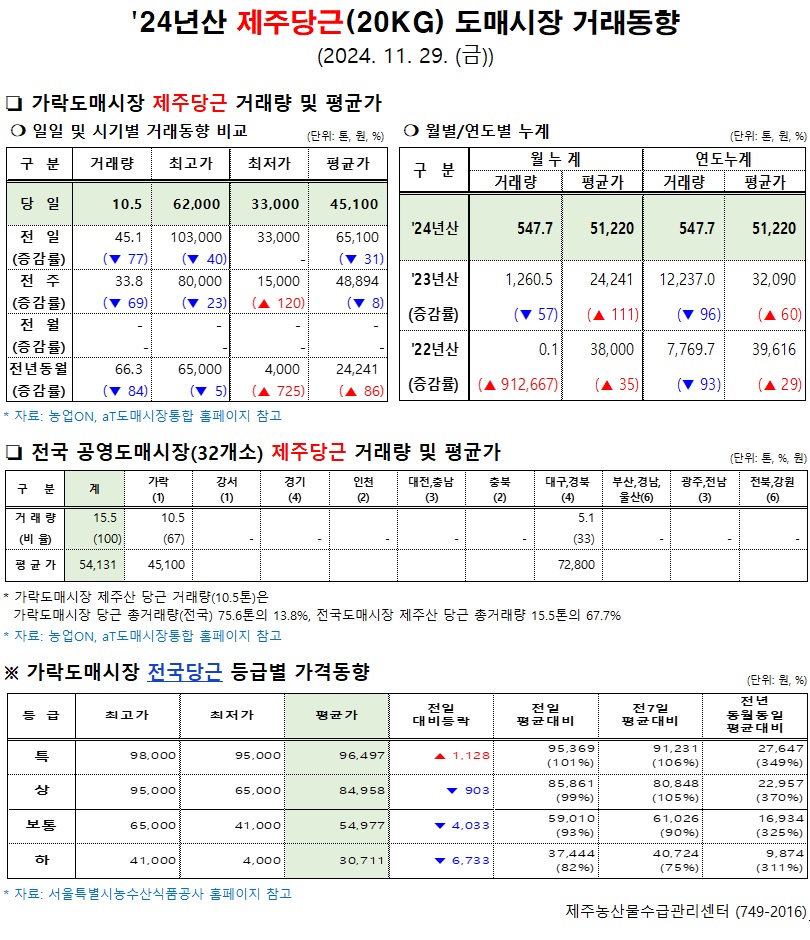 '24년산 제주당근(20kg) 도매시장 거래동향(11/29)