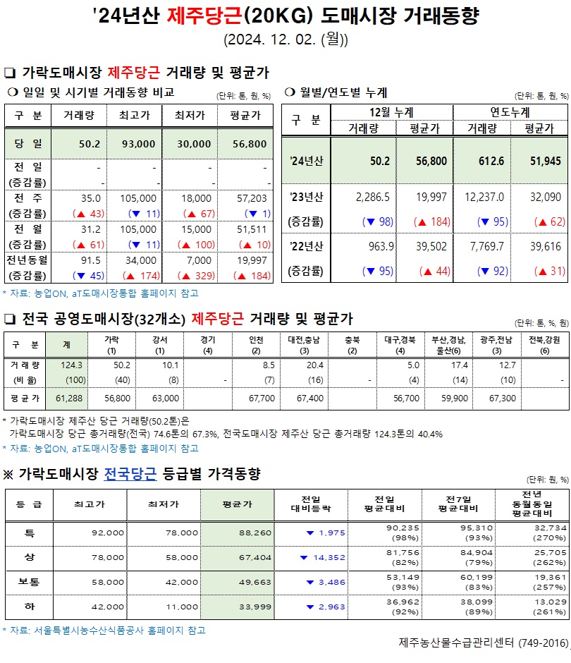 '24년산 제주당근(20kg) 도매시장 거래동향(12/02)