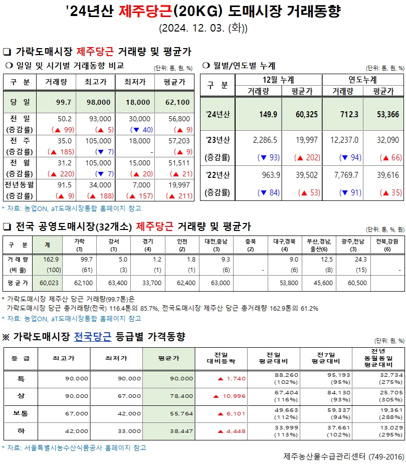 '24년산 제주당근(20kg) 도매시장 거래동향(12/03)