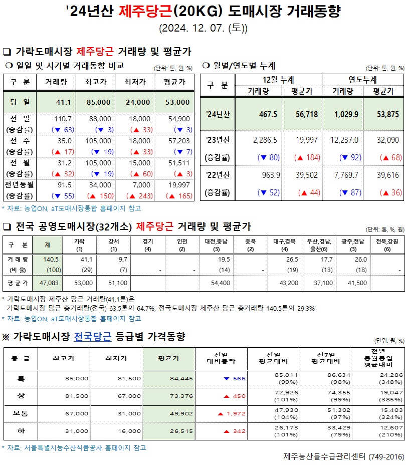 '24년산 제주당근(20kg) 도매시장 거래동향(12/07)