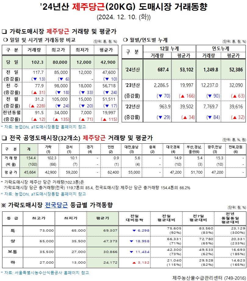 '24년산 제주당근(20kg) 도매시장 거래동향(12/10)