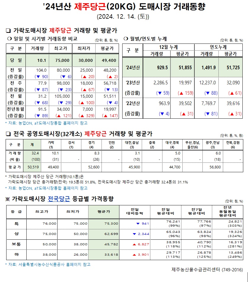 '24년산 제주당근(20kg) 도매시장 거래동향(12/14)