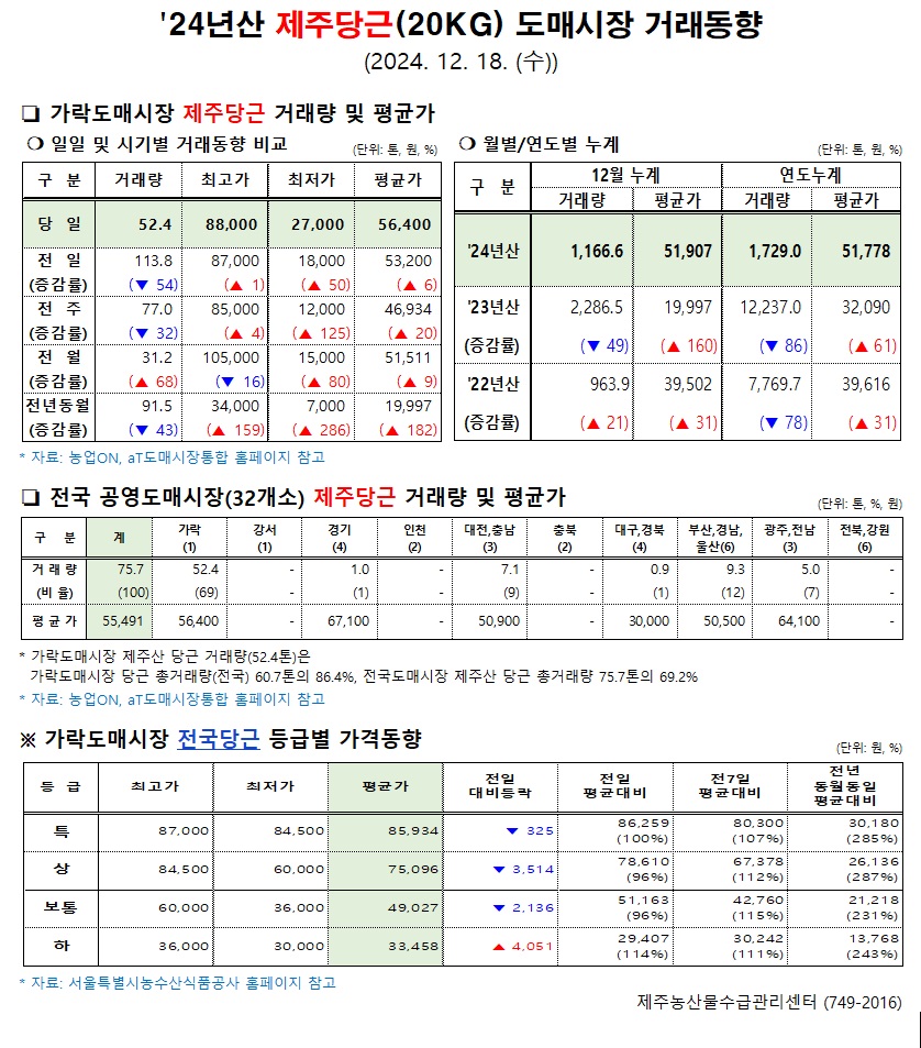 '24년산 제주당근(20kg) 도매시장 거래동향(12/18)