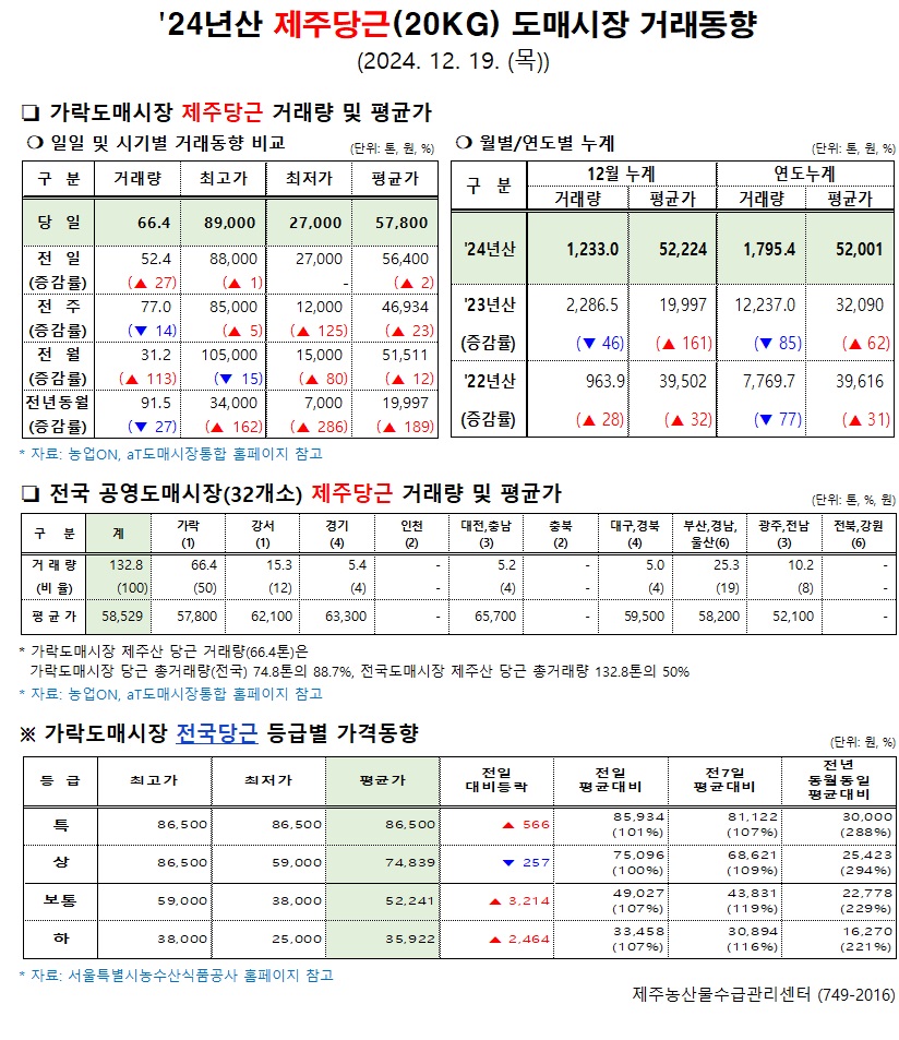 '24년산 제주당근(20kg) 도매시장 거래동향(12/19)