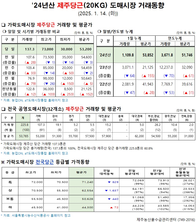 '24년산 제주당근(20kg) 도매시장 거래동향(1/14)