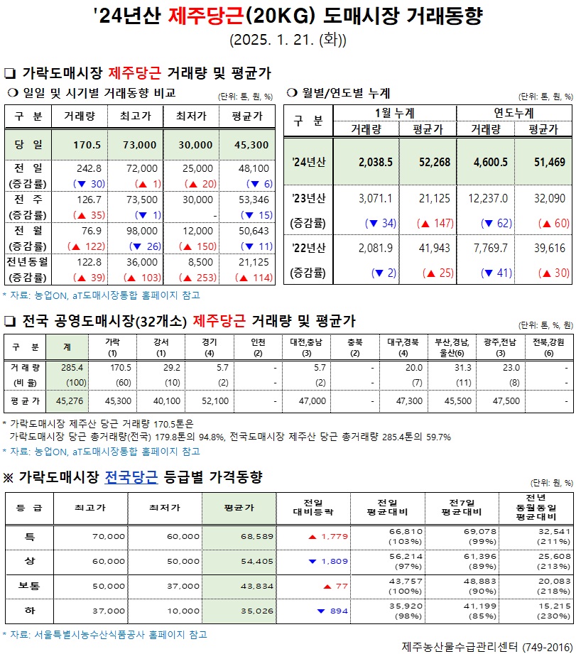 '24년산 제주당근(20kg) 도매시장 거래동향(1/21)
